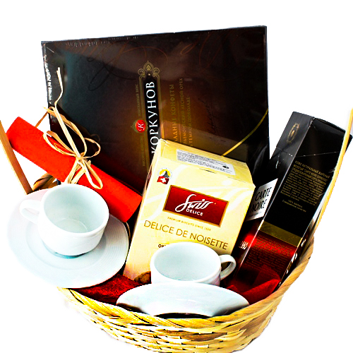 Состав: корзина, кофе , 2 чашки, печенье , конфеты коркунов. поздравление пожрникам